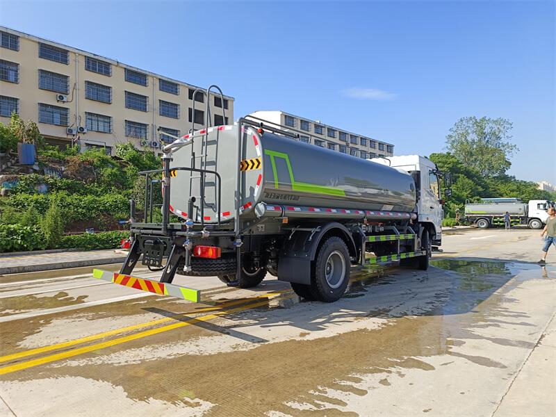 東風15噸灑水車標配前噴(鴨嘴)、后沖、后灑、側噴、后置式工作 平臺,平臺上配置綠化水炮(可 360°旋轉,既可以調成柱狀,也可 以調成霧狀,更可以調成直沖狀、大雨、中雨、小雨、毛毛雨),配 備優質大功率專用灑水泵(可自吸自排,可從河里或池塘抽水到罐體), 取力器,雜物過濾網,消防接口,自流球閥系統、取力器、球閥、濾網 均為國家標準產品,主管道加粗,法蘭墊、法蘭盤加厚,大通徑球閥。 整體具備性能優良安全可靠、效率高、流量大、維修方便等特點。