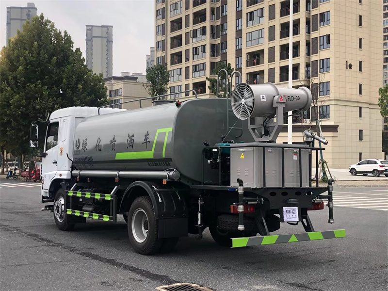 后灑、帶側噴(花灑)、帶后工作平臺、平臺上安裝綠化灑水高炮(炮噴射形狀可調節:直沖、大雨、中雨、毛毛雨、