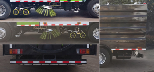 該車裝備有垃圾箱、水箱、洗掃刷等專用裝置,用于清掃、 清洗垃圾等污物;側防護由專用裝置替代,后下部防護材料為Q235A碳鋼,與副梁采用焊接連接, 截面尺寸:50×120(mm),離地面高度400mm;ABS及其控制器型號為:1、 CM4XL-4S/4M,生產廠家為:廣州瑞立科密汽車電子股份有限公司; 2、APG3550500A,生產廠家為:浙江亞太機電股份有限公司. |