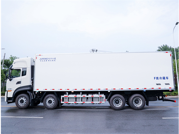 東風天龍9米6冷藏車廂體配置為:斷橋隔溫工藝,整體結構框架,內外面料為3mm新款啞光玻璃鋼夾保溫層真空復合而成,廂體厚度為8cm,最新款鋁合金包邊型材,型材局部厚度為4mm(鋼制鉚釘加固),廂體內部采用2個LED照明燈及廂體示寬燈,后門框不銹鋼材質,門框密封條為三元乙丙橡膠材質,加厚型不銹鋼合頁及鎖件;副梁為Q700車用大梁鋼,15mm厚大梁墊皮,加裝防撞膠塊,不銹鋼門鎖件,配后雙開門,副駕駛一側居中靠前開單側門一個,帶2個排水孔。