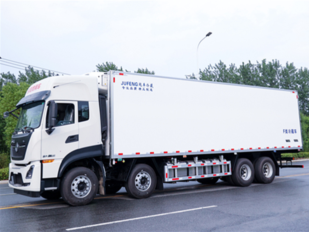 東風天龍9米6冷藏車廂體配置為:斷橋隔溫工藝,整體結構框架,內外面料為3mm新款啞光玻璃鋼夾保溫層真空復合而成,廂體厚度為8cm,最新款鋁合金包邊型材,型材局部厚度為4mm(鋼制鉚釘加固),廂體內部采用2個LED照明燈及廂體示寬燈,后門框不銹鋼材質,門框密封條為三元乙丙橡膠材質,加厚型不銹鋼合頁及鎖件;副梁為Q700車用大梁鋼,15mm厚大梁墊皮,加裝防撞膠塊,不銹鋼門鎖件,配后雙開門,副駕駛一側居中靠前開單側門一個,帶2個排水孔。