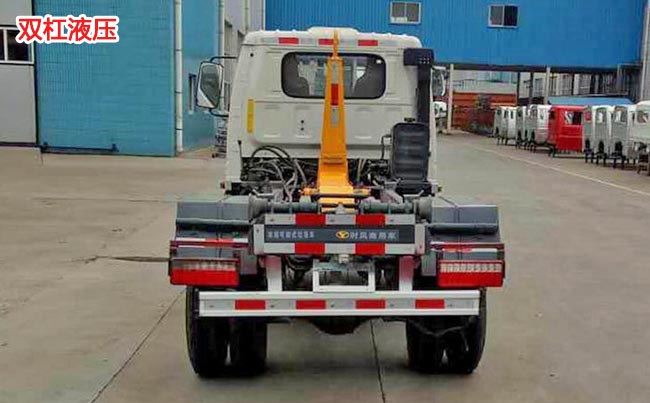 配套3~4立方米勾臂垃圾箱,拉臂材料為高強(qiáng)度碳鋼板,雙液壓油缸,采用國內(nèi)知名油泵、油缸及多路閥。駕駛室外部操作,加強(qiáng)副梁,尾部帶有滾輪、垃圾箱鎖緊裝置,上藍(lán)牌。