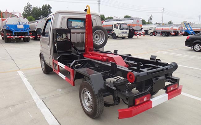配套2~3立方米勾臂垃圾箱,高強度主勾臂,雙杠液壓,采用國產油泵、多路閥、液壓油缸、車身顏色根據客戶要求更改,尾部帶鎖緊裝置、滾輪。