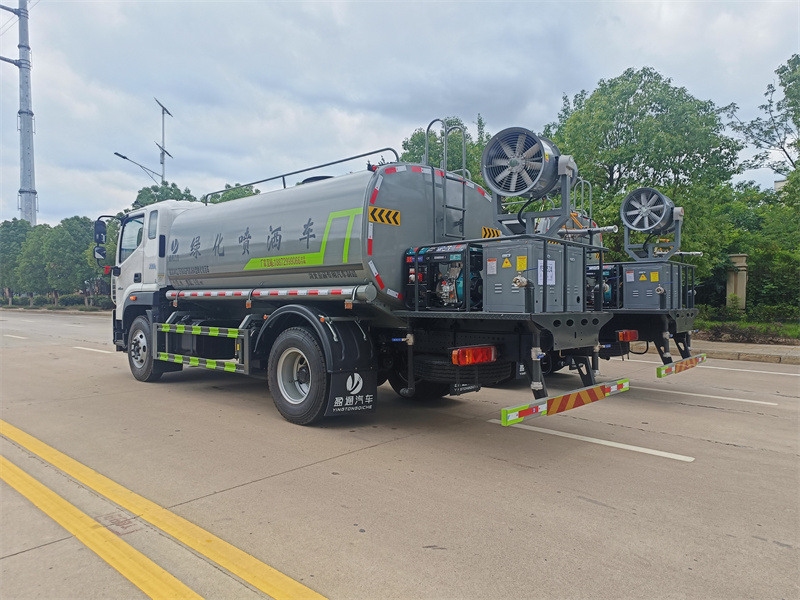 罐體約為 15 方、邊燈帶電,罐體尾部上方標(biāo)配 2 個(gè)紅色示寬燈 、前噴為鴨嘴直沖,標(biāo)配后對(duì)沖,用戶可根據(jù)自己的需求,來調(diào)整對(duì)沖位置 、沖孔平臺(tái)(承載能力加強(qiáng)),炮筒后蓋為定制型螺栓卡扣 、前噴、后對(duì)沖、后灑球閥均采用 50 大通徑不銹鋼球閥 、新式軸承式水炮,更加耐用。配 60-90 型水泵 、側(cè)噴和高炮管道加粗并配 65 大通徑不銹鋼球閥,壓力更大 、防腐法蘭墊片 、鋁制后灑,不易炸開 、罐體自動(dòng)焊(美國(guó)林肯焊機(jī)及電源),拼板自動(dòng)焊接封頭環(huán)縫焊接,無氣 孔焊縫美觀 、爬梯、側(cè)護(hù)網(wǎng)、后保險(xiǎn)杠均為螺栓連接方便拆卸維修 、塑料擋泥板替代鐵擋泥板更加輕便,用螺栓連接方便拆卸 、前部、后部主管連接處為 6 孔圓法蘭連接不易沖墊