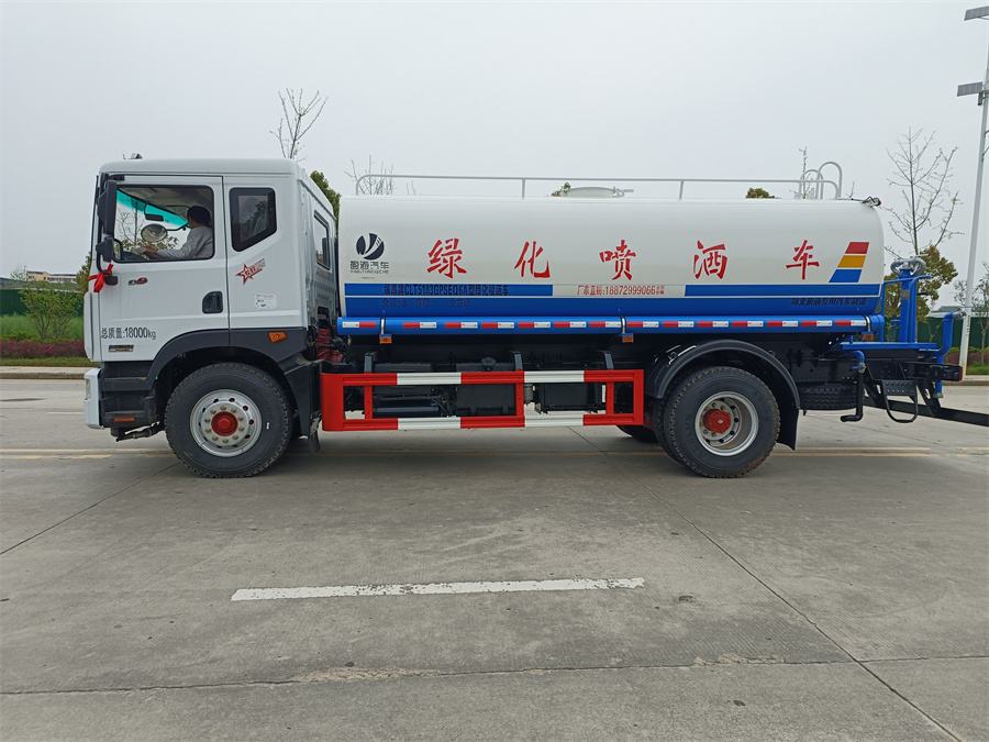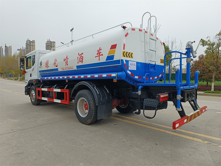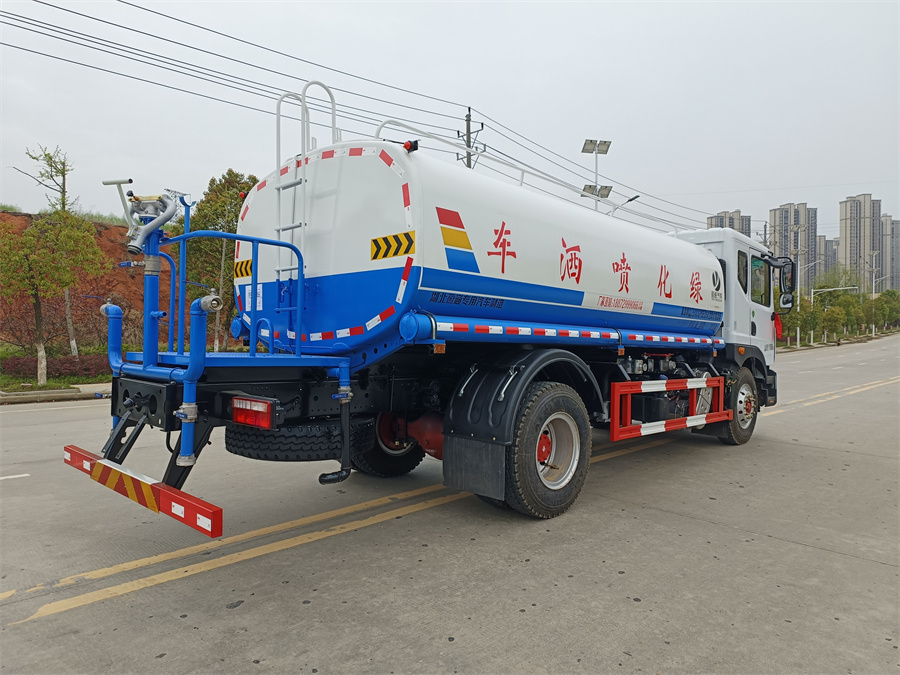 灑水車產品標配前噴(鴨嘴)、后沖、后灑、側噴、后置式工作 平臺,平臺上配置綠化水炮(可 360°旋轉,既可以調成柱狀,也可 以調成霧狀,更可以調成直沖狀、大雨、中雨、小雨、毛毛雨),配 備優質大功率專用灑水泵(可自吸自排,可從河里或池塘抽水到罐體), 取力器,雜物過濾網,消防接口,自流球閥系統、取力器、球閥、濾網 均為國家標準產品,主管道加粗,法蘭墊、法蘭盤加厚,大通徑球閥。 整體具備性能優良安全可靠、效率高、流量大、維修方便等特點。