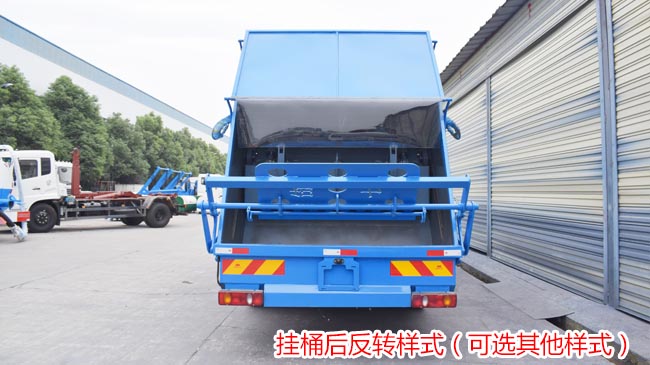 新款無筋條箱體,平面圓弧美觀大方,有效壓縮容積8立方,尾部帶翻轉上料機構,電控手動雙操控器,駕駛室與車尾部雙控制箱,尾部帶3厘米厚橡膠密封壓條,帶污水收集槽,大容量污水箱。箱體可按要求噴繪圖案和字樣。