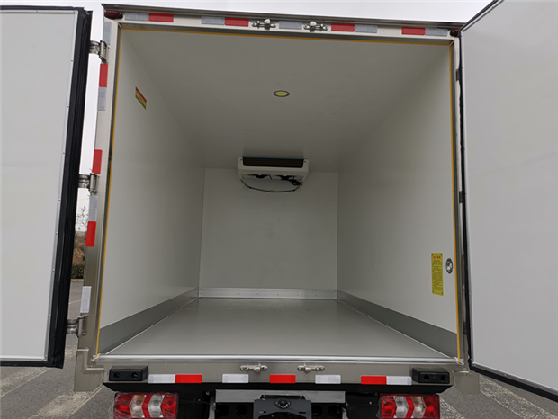 國六寬體江鈴凱運4米2冷藏車廂體配置為:采用斷橋隔熱工藝,整體框架結構制作,廂體內、外壁材料為玻璃鋼板,采用高密度保溫層,廂板內帶有骨架,廂體厚度80mm,門框,門飾件、包角全部使用不銹鋼材質。最新款鋁合金包邊型材,廂體內采用LED照明燈及廂體示寬燈;門框密封條為橡膠材質,后門梁帶加厚防撞塊,加厚型不銹鋼鉸鏈及鎖件。車體副梁采用510L高強度鋼制作,底板為鋁花紋板,車廂后門帶一個上車扶手,其余標配;