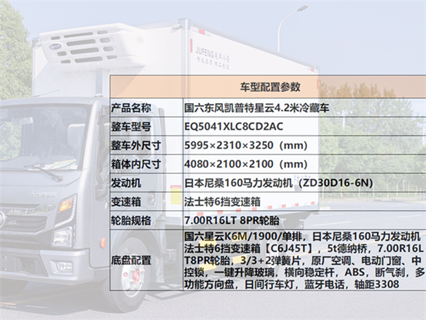 東風(fēng)星云4米2冷藏車車身配置為:東風(fēng)K6M1900寬單排駕駛室,東風(fēng)輕型發(fā)動(dòng)機(jī),型號為:ZD30D16-6N,法士特6檔變速箱,型號為:C6J45T,5噸后橋德納橋,190mm車架,7.00R16LT 8PR輪胎,3/3+2彈簧片,原裝空調(diào),電動(dòng)窗,中控鎖,一鍵升降玻璃,橫向穩(wěn)定桿,ABS,斷氣剎,多功能方向盤,日間行車燈,藍(lán)牙電話。