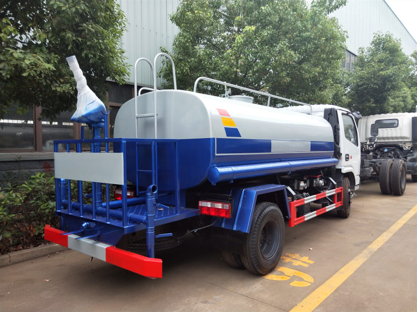 5噸灑水車罐體采用4MM厚武鋼專用容積板一次卷壓成型,完全做到無縫成型。此款灑水車水泵垂直吸程≧7米,前沖灑水寬度≧16米。罐體內設多道防波隔板,采用高壓氣體試漏檢測,使罐體具有強度高,重心穩,車輛運載安全平穩。大功率水泵,灑水車前沖(噴)后灑,帶側噴,帶65消防接口,后平臺帶泡不帶門,前封頭帶水位計,后平臺主管路帶1寸澆花接口,后爬梯,配3米長抽水鋼絲塑料管兩根,用于抽水作業使用;罐后帶工作平臺,平臺上帶安全護欄,裝高位綠化灑水炮一個,灑水炮可全方位360度旋轉,可連續調成直沖狀、大雨、小雨、毛毛雨等不同噴灑方式,調成直沖狀射程長度≥28m、高度≥12m,調成細雨狀射程寬度≥15m