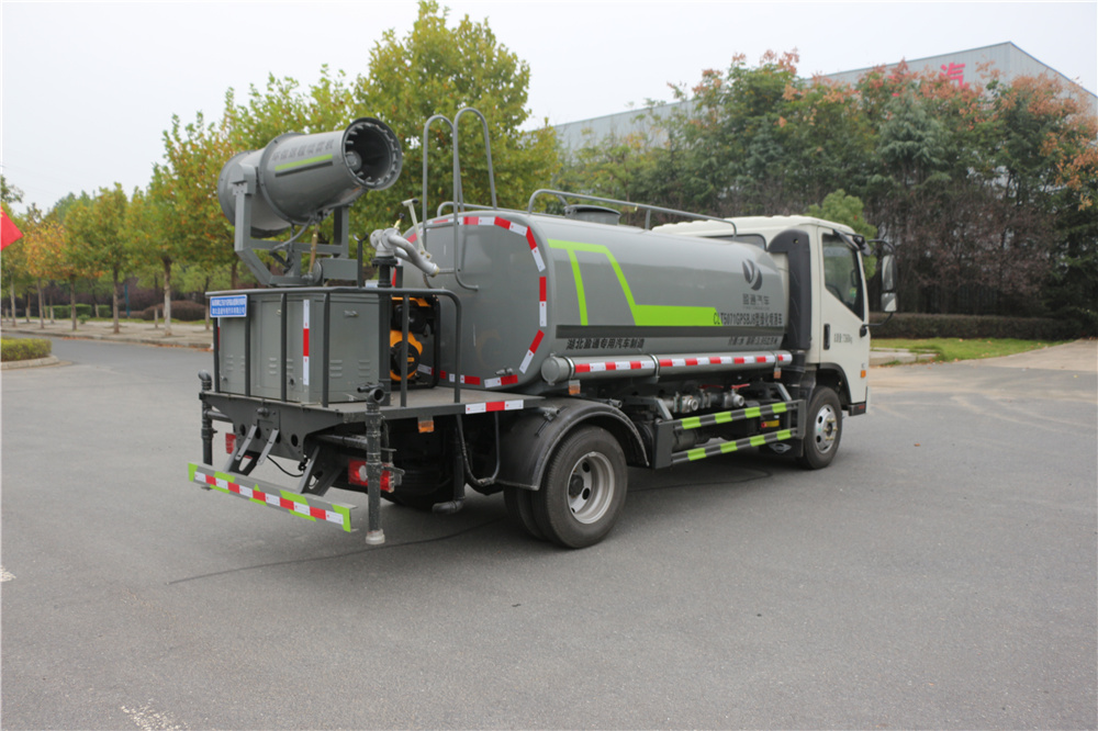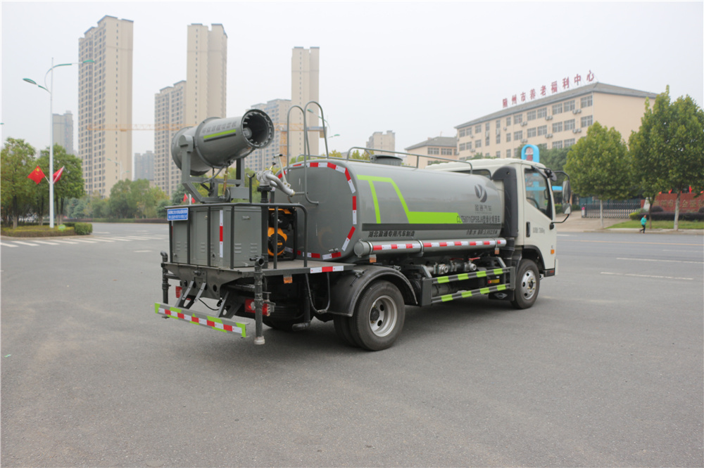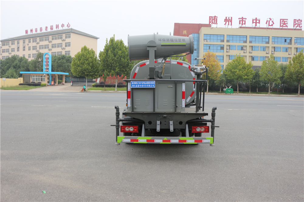 • 專用功能配置:罐體實際容積為5立方米,采用武鋼優質碳鋼板卷壓成型。配備專用灑水泵,自吸自排,前噴后灑、側噴、后工作平臺及灑水高壓炮。灑水泵自吸高度為6米左右,整車灑水寬度14米左右,后工作平臺水炮可調成:直沖狀、大雨、中雨、小雨、毛毛雨,有效射程≥28米,整車帶接頭、水位計,自流閥及自吸功能。后工作平臺主管道帶1寸澆花接口,附送2根3米水管,1個爬梯,兩側及后保險杠。