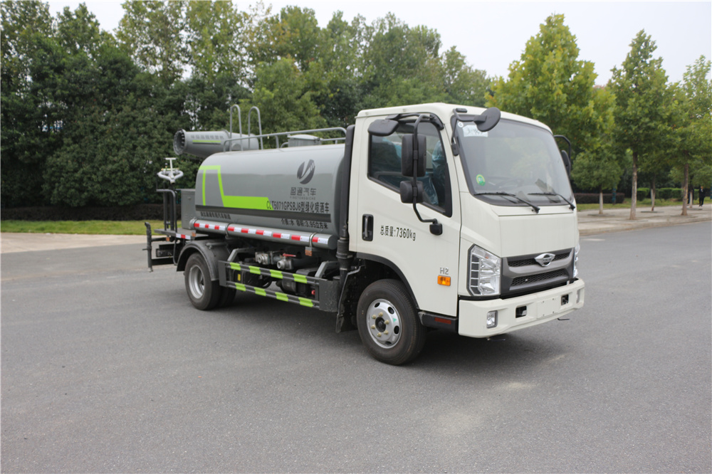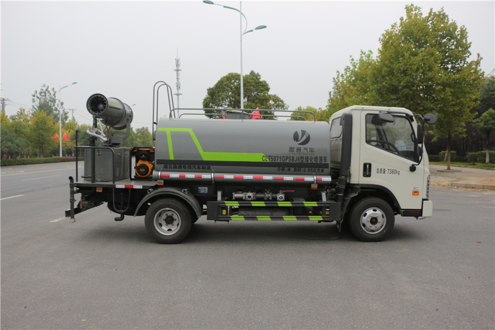 整車說明:選裝噴霧裝置樣式。該車主要用于城鄉園林綠化噴灑,噴藥;主要裝置為水罐及噴灑裝置;罐體有效容積:3.95立方米;罐體外形尺寸(長×長軸×短軸)(mm):2900×1650×1200;隨底盤選裝駕駛室;側、后防護材料均為:Q235碳鋼,連接方式均為:螺栓連接,后部防護截面尺寸(mm):120×50,后部防護離地高度(mm):430;ABS系統控制器型號為CM4XL-4S/4M,ABS系統控制器生產企業為廣州瑞立科密汽車電子股份有限公司.