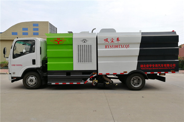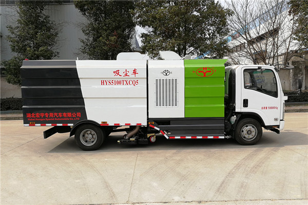 該吸塵車是采用五十鈴國五二類原廠汽車底盤改裝,加裝副發(fā)動(dòng)機(jī)、風(fēng)機(jī)、清水箱、垃圾箱、中置吸盤,工作視頻探頭,自動(dòng)脈沖清理功能,液壓系統(tǒng)、專用裝置電控系統(tǒng)和副車架等改裝而成。