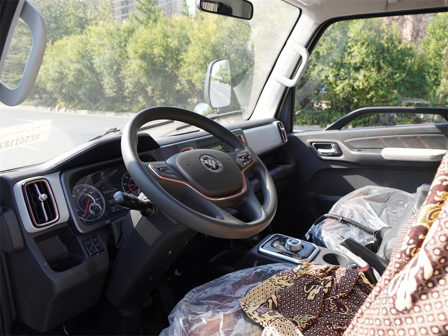 電動壓縮式垃圾車該車專用裝置主要為垃圾箱和液壓系統,用于垃圾裝載清運;側防護材料為鋁合金+Q235碳鋼,側防護連接方式為螺栓連接;后防護由專用裝置代替,下邊緣離地高為360mm;蓄電池為磷酸鐵鋰蓄電池,成箱后的儲能裝置總成型號:L173TB3,儲能裝置總成生產企業:寧德時代新能源科技股份有限公司,儲能裝置單體型號:CB220,儲能裝置單體生產企業:寧德時代新能源科技股份有限公司;驅動電機類型為永磁同步電機,型號為FTTBP075B,額定功率為45kW,峰值功率為90kW,生產企業為北汽福田汽車股份有限公司.ABS型號是YF9,生產企業是武漢元豐汽車電控系統有限公司,選裝ABS型號是CM4YL,生產企業是廣州瑞立科密汽車電子股份有限公司.該車型可選裝直接供電式ETC車載裝置.該車整備質量不包含備胎、滅火器和隨車工具.整備質量(kg)/貨箱質量(kg)對應關系:3780/1930,3660/1810;貨箱材質為Q235鋼板,底板厚度為2mm,側板和頂板厚度為2mm.隨底盤選裝logo標識.選裝上料裝置樣式.整車長度/后懸/后伸對應關系(mm):5995/1815/250,5810/1795/85.后部作業燈具僅在車輛駐車作業時開啟.