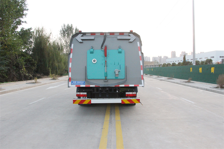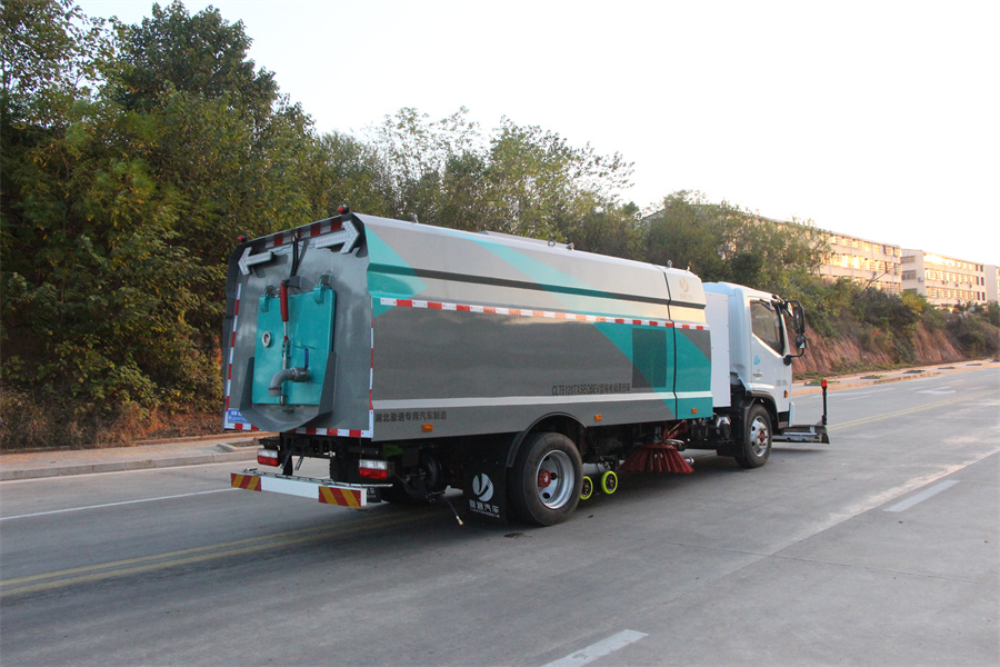 該車主要用于清掃、清洗路面垃圾污物;主要裝置為箱體及清掃裝置;側防護由專用裝置代替,后下部防護材料為:Q235碳鋼,連接方式為:螺栓連接;后下部防護截面尺寸(mm):120×50,后下部防護離地高度(mm):430;儲能種類/單體及總成生產企業:磷酸鐵鋰蓄電池/寧德時代新能源科技股份有限公司;電機額定功率:110kW;電機峰值功率:180kW;ABS系統型號:ABS/ASR-24V-4S/4M,生產企業:襄陽東風隆誠機械有限責任公司;整車長度為8810mm時,前伸為980mm;選裝前部不帶高壓清洗裝置,該狀態下車輛長度為7830mm;車輛后部箭頭燈和前部作業指示燈僅在作業時開啟;采用底盤4250mm軸距改裝.選裝左右側面樣式.
