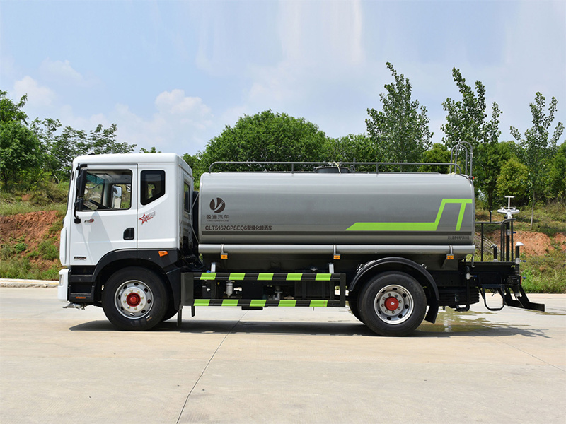 東風12噸灑水車產品標配前噴(鴨嘴)、后沖、后灑、側噴、后置式工作 平臺,平臺上配置綠化水炮(可 360°旋轉,既可以調成柱狀,也可 以調成霧狀,更可以調成直沖狀、大雨、中雨、小雨、毛毛雨),配 備優質大功率專用灑水泵(可自吸自排,可從河里或池塘抽水到罐體), 取力器,雜物過濾網,消防接口,自流球閥系統、取力器、球閥、濾網 均為國家標準產品,主管道加粗,法蘭墊、法蘭盤加厚,大通徑球閥。 整體具備性能優良安全可靠、效率高、流量大、維修方便等特點。